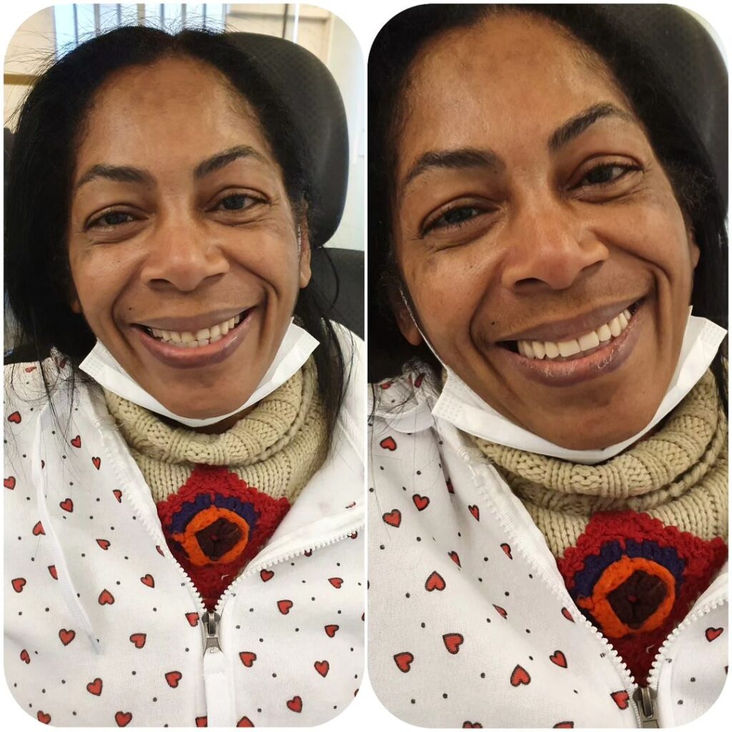 Foi feito implantes superiores e uma Prótese nova com sistema Protocolo, este ao qual a prótese fica totalmente fixa sobre implantes, trazendo assim mais conforto e confiança para a paciente podendo comer alimentos mais duros com segurança.